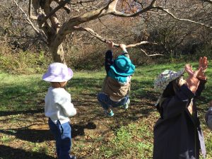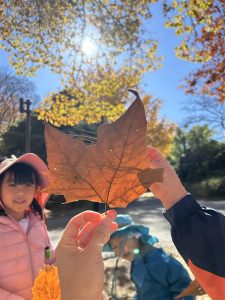 幼稚園にはない大きな葉っぱを見つけて大喜び。お日様に当てるとキラキラ光って綺麗!