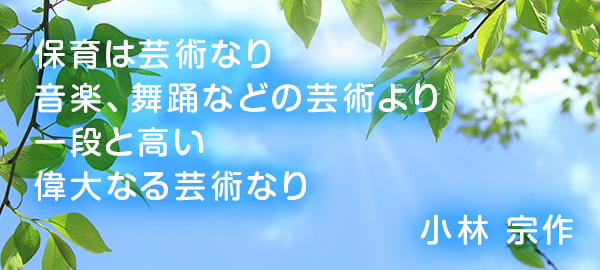 未来に生きる子どもを育てる保育の仕事に、これほど温かな言葉、高い価値をおいた音楽家がいるでしょうか。その人が「窓際のトットちゃん」の先生として有名な本園の創設者、小林宗作です。本園は、まだ武蔵野の雑木林が林立する昭和25年6月に創設されました。